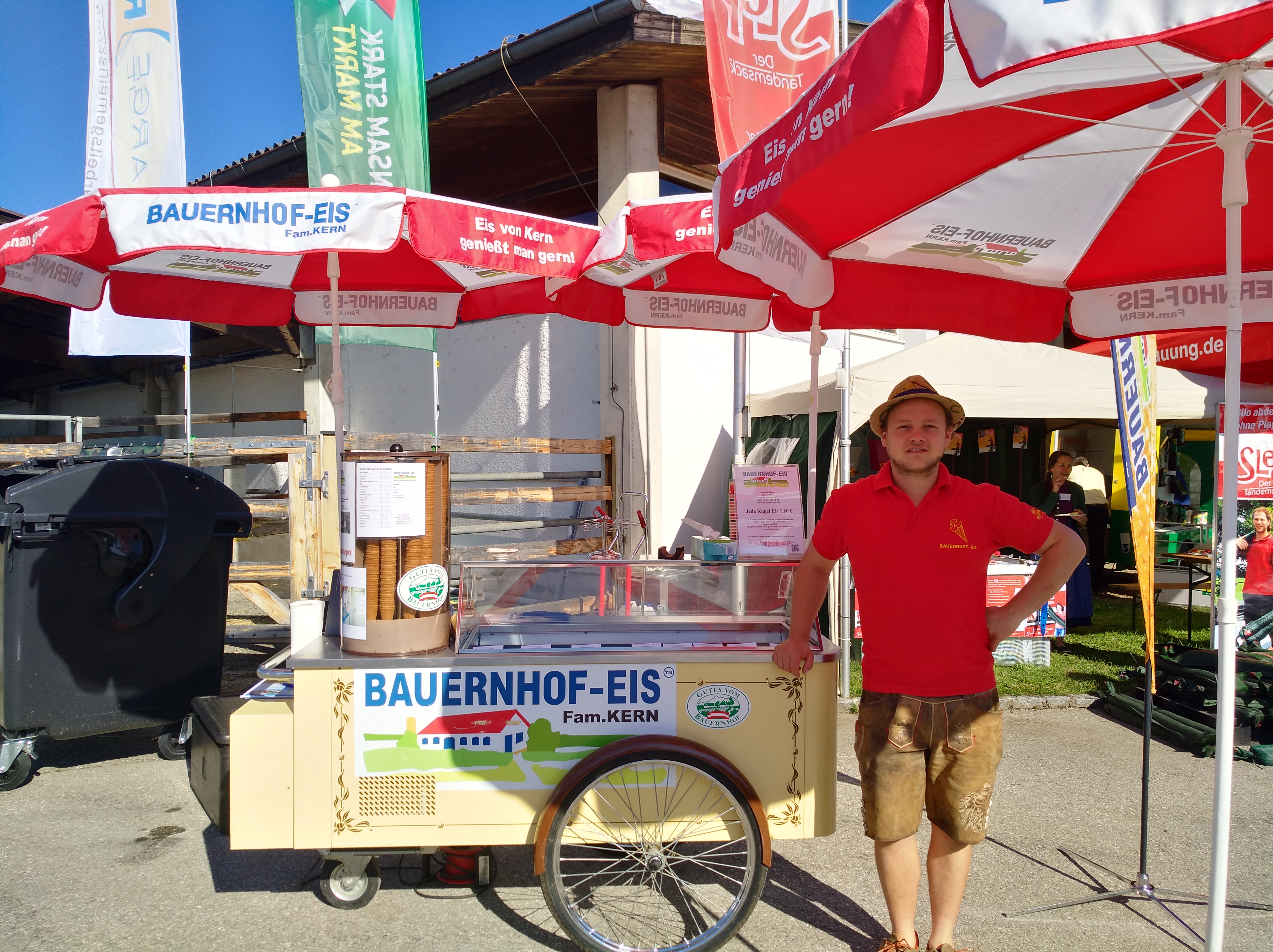 Zum selbst verkaufen von Bauernhof-Eis kann eine Eistruhe mit 100ml Becher oder ein Eiswagen zum Verkauf von Tüteneis gemietet werden.